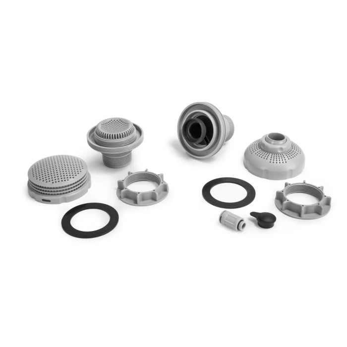 - 1 crépine de refoulement orientable permettant de diriger le flux d’eau sortant de votre système de filtration dans la direction voulue à l’intérieur de votre piscine.
